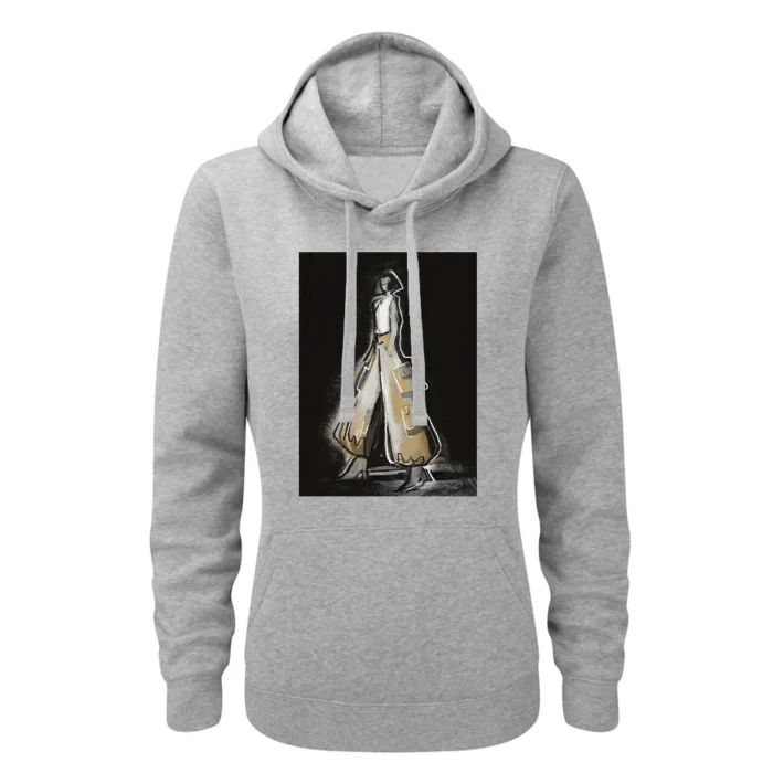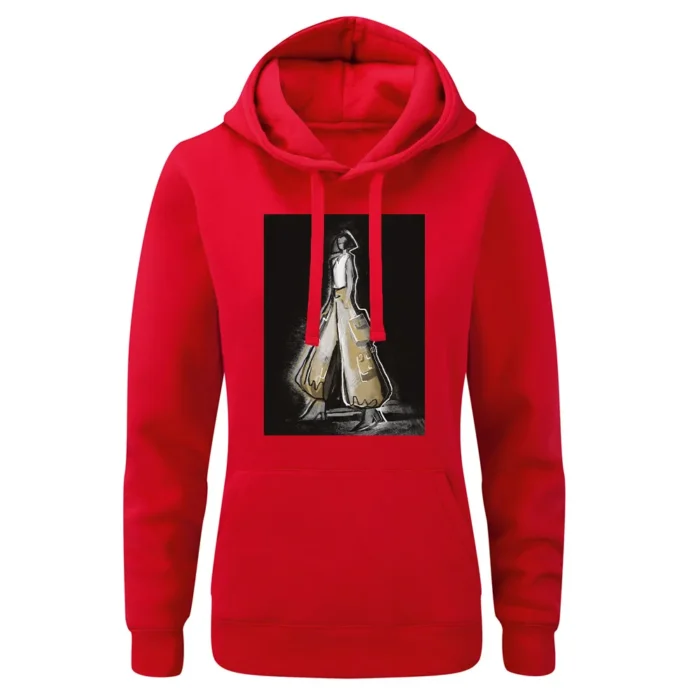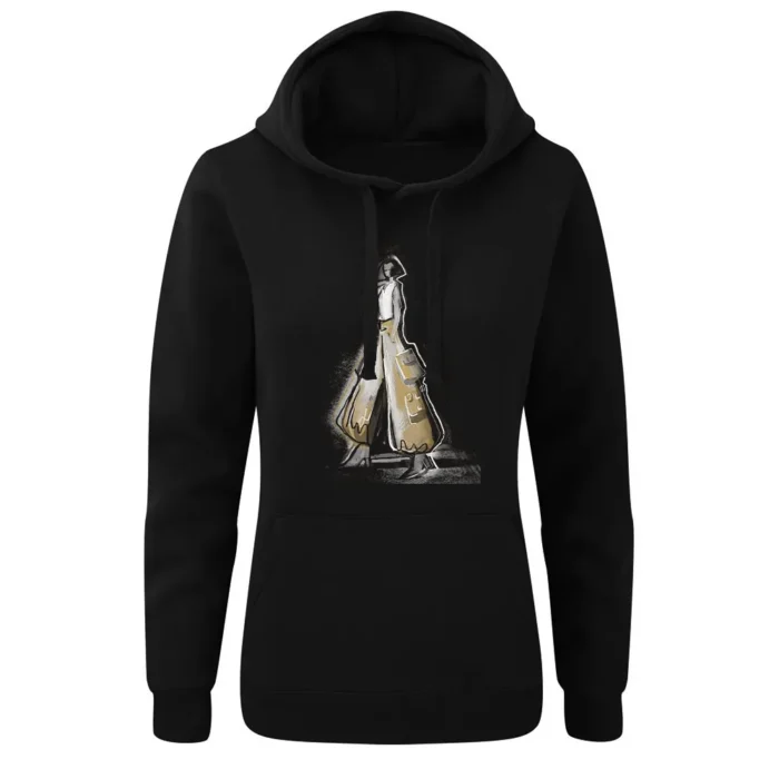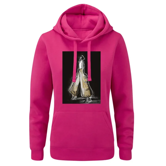 Bluza damska z kapturem z grafiką Eli Góreckiej „CARGO PANTS” to wyrazisty, projektowy akcent o streetwearowym charakterze. Na froncie techniczny szkic spodni cargo z przeskalowanymi kieszeniami, szlufkami i wyraźnymi przeszyciami — poprowadzony pewną, kaligraficzną kreską. Oszczędna paleta i mocny kontur nadają ilustracji plakatową czytelność, która „łapie” wzrok z daleka. Z bliska widać konstrukcyjne smaczki: linie cięć, stebnowania i fałdy budujące wrażenie objętości. Kompozycja jest czysta i graficzna, a jednocześnie emanuje energią szkicu prosto z pracowni projektanta. Idealna dla miłośniczek mody, krawiectwa i minimalistycznej ilustracji — gdy chcesz dodać stylizacji nowoczesnego, „atelierowego” pazura.