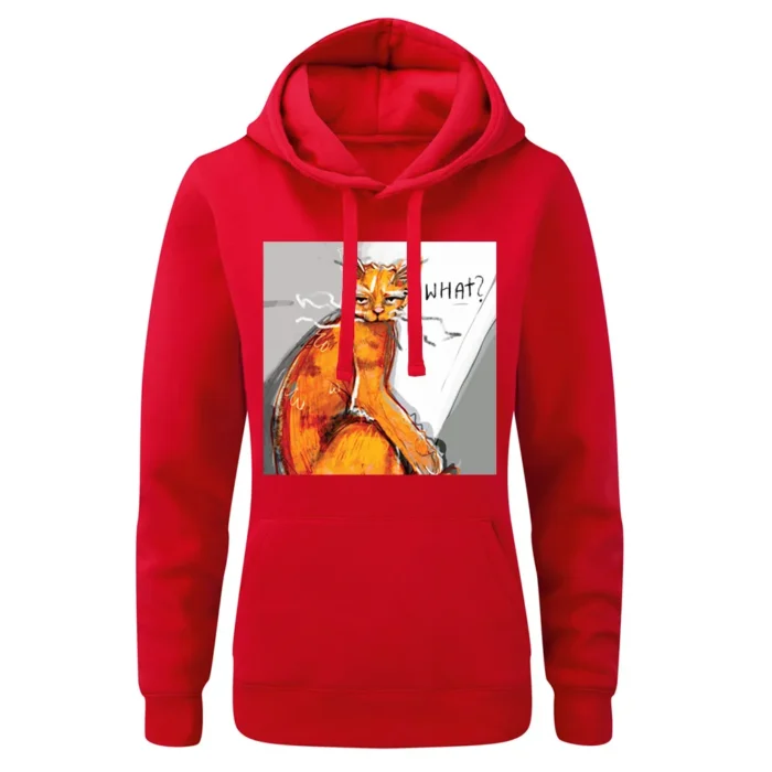Bluza damska z kapturem z grafiką Eli Góreckiej „Dzień Kota — WHAT” to komiksowy kadr pełen zaskoczenia i humoru. W centrum kocia bohaterka z szeroko otwartymi oczami, narysowana mocnym, plakatowym konturem i podbita dynamicznymi liniami ruchu. Dymek z krótkim „WHAT?” działa jak punchline — prosty, wyrazisty i natychmiast zrozumiały. Rasterkowe „kropki” oraz kontrast czerni z żywymi akcentami kolorystycznymi nadają ilustracji energię i czytelność z daleka. Na większym formacie bluzy motyw działa jak mini plakat: przyciąga wzrok w ruchu i bawi detalami z bliska. Idealna dla kociar i fanek popkultury — na Dzień Kota, luźne wyjścia i momenty, gdy chcesz powiedzieć „serio?” bez słów.