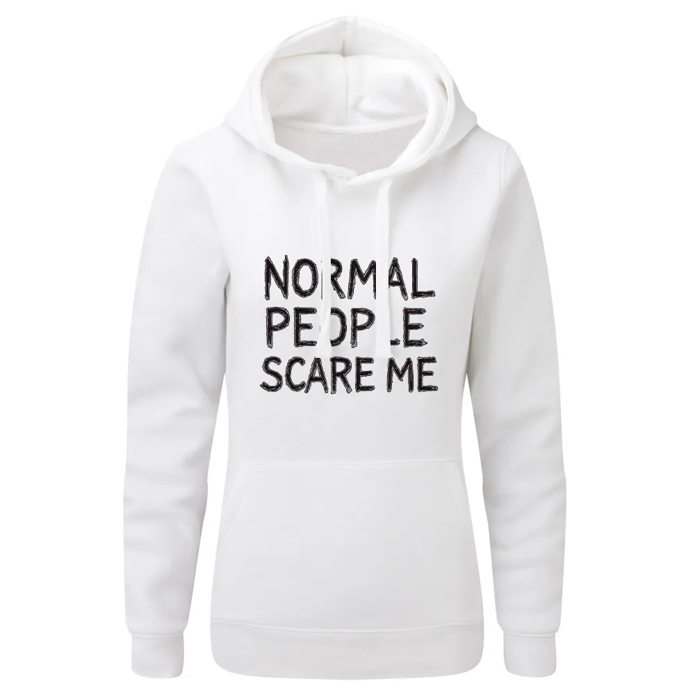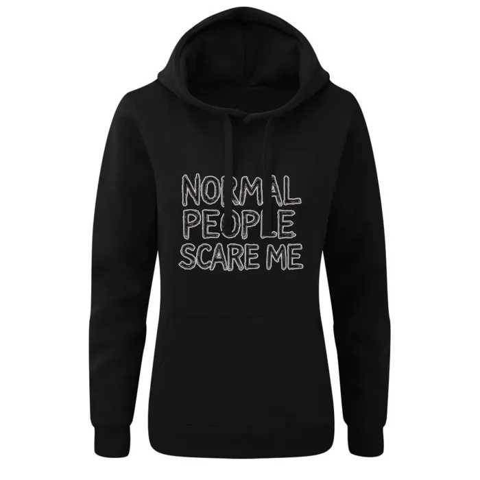 Bluza damska z kapturem z grafiką Andrzeja Warty „NORMAL PEOPLE SCARE ME” to typograficzny statement z nutą mrocznego humoru. W centrum hasło „NORMAL PEOPLE SCARE ME” zapisane nieregularnym, ręcznie rysowanym liternictwem — celowo „zgrzyta” i od razu przyciąga wzrok. Piętrowy układ słów, mocny kontur i sporo „powietrza” wokół liter dają plakatową czytelność już z daleka. Subtelne przetarcia i delikatne „szumy” dodają lekko grunge’owego charakteru, jak plakat zdjęty ze ściany klubu. Z bliska widać rytm liter i smaczki linii, które nadają przekazowi autentyczności. Bluza damska z kapturem z grafiką Andrzeja Warty „NORMAL PEOPLE SCARE ME” mówi wprost: „jestem inna” — prosto, głośno i z autoironią, idealna na miasto i koncerty.