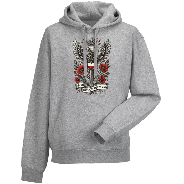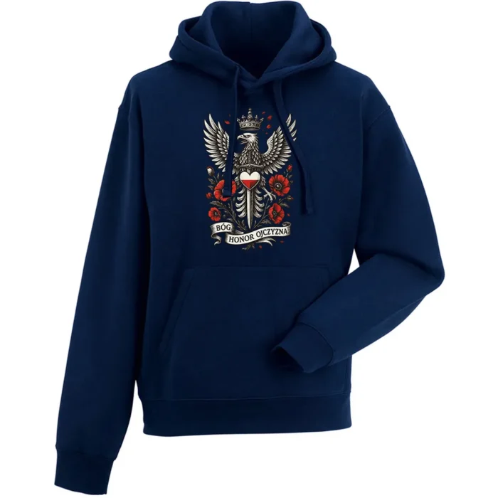 Bluza męska z kapturem „Bóg • Honor • Ojczyzna” to minimalizm z charakterem — miejski fason z autorską typografią Barbary Holda, łączącą prostotę formy z symbolicznym przekazem. Mocny kontur liter i klarowny układ kropek tworzą nowoczesny, graficzny rytm, który wyraża dumę bez patosu. Klasyczny krój, kaptur i kieszeń kangurka dbają o wygodę na co dzień — od porannej kawy po wieczorny spacer. Motyw porządkuje stylizację i świetnie gra z jeansami, joggerami oraz overshirtem, a równie dobrze wygląda solo. Sprawdzi się do pracy, na miasto i na weekend — dodaje charakteru w uporządkowany, współczesny sposób. Lubisz spójność? Połącz bluzę z koszulką lub torbą w tym samym motywie i stwórz praktyczny, codzienny set.