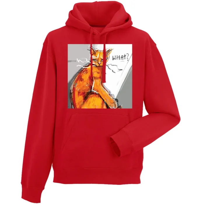 Bluza męska z kapturem z grafiką Eli Góreckiej „Dzień Kota — WHAT” to komiksowy kadr pełen zaskoczenia i humoru. W centrum koci bohater z szeroko otwartymi oczami, narysowany mocnym, plakatowym konturem i podbity dynamicznymi liniami ruchu. Dymek z krótkim „WHAT?” działa jak punchline — prosty, wyrazisty i natychmiast zrozumiały. Rasterkowe „kropki” oraz kontrast czerni z żywymi akcentami kolorystycznymi nadają ilustracji energię i czytelność z daleka. Na większym formacie bluzy motyw działa jak mini plakat: przyciąga wzrok w ruchu i bawi detalami z bliska. Idealna dla kociarzy i fanów popkultury — kiedy chcesz powiedzieć „serio?” bez słów.