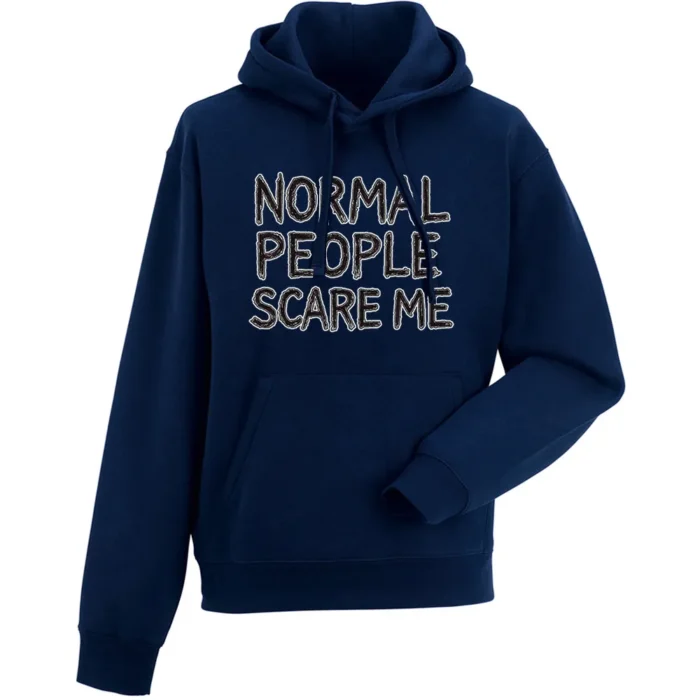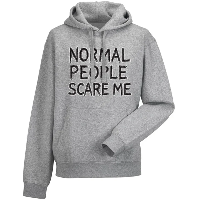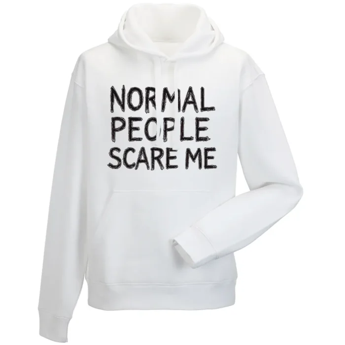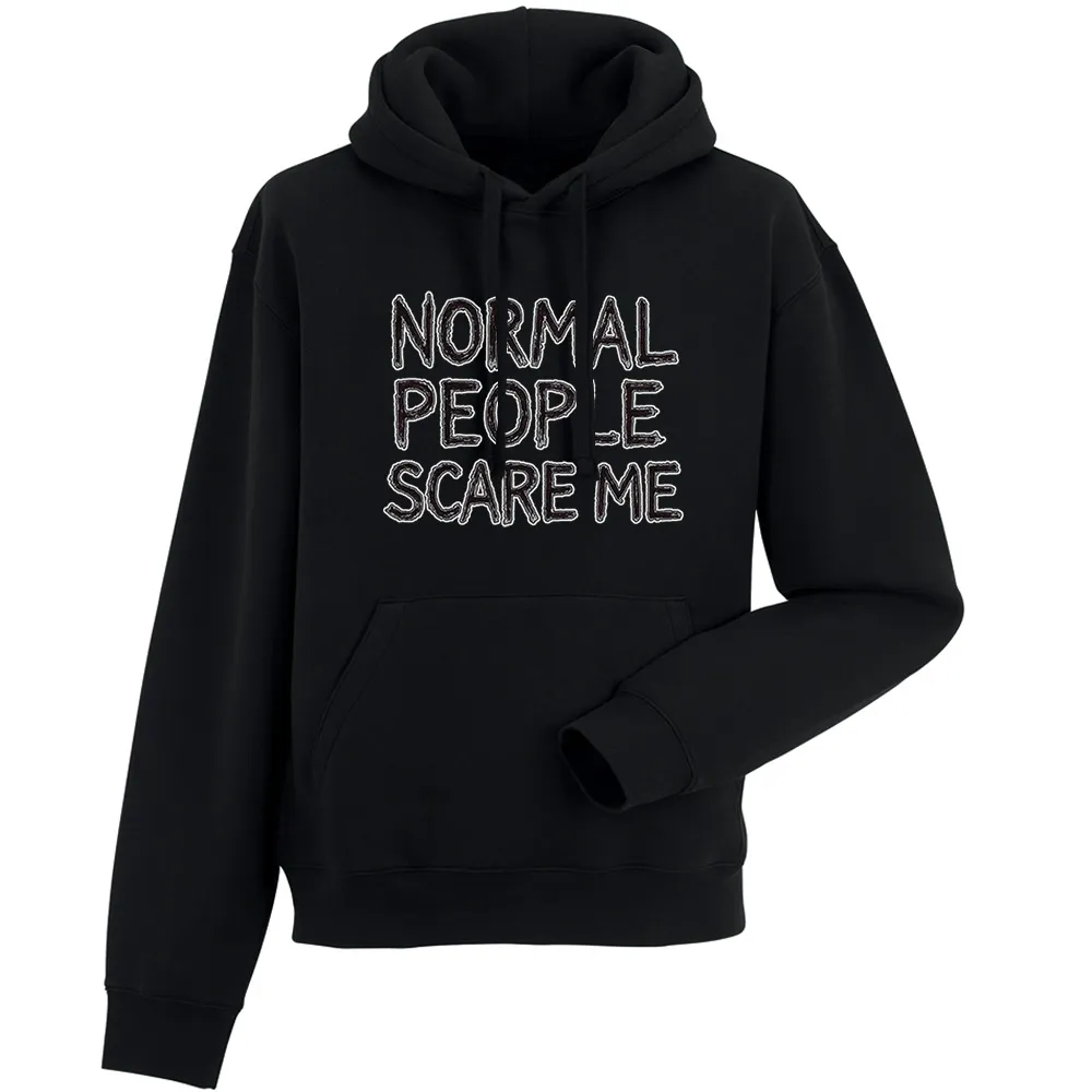 Bluza męska z kapturem z grafiką Andrzeja Warty „NORMAL PEOPLE SCARE ME” to typograficzny statement z nutą mrocznego humoru. Centralnie wybrzmiewa hasło „NORMAL PEOPLE SCARE ME” zapisane nieregularnym, ręcznie rysowanym liternictwem, które celowo „zgrzyta” i przyciąga wzrok. Piętrowy układ słów, mocny kontur i dużo „powietrza” wokół liter dają plakatową czytelność już z daleka. Subtelne przetarcia i delikatne „szumy” nadają całości lekko grunge’owy charakter, jak plakat zdjęty ze ściany klubu. Z bliska widać rytm liter i smaczki linii, które dodają ilustracji autentyczności. Bluza męska z kapturem z grafiką Andrzeja Warty „NORMAL PEOPLE SCARE ME” mówi wprost: „jestem inny” — prosto, głośno i z autoironią, idealnie na miasto, koncert i codzienne stylizacje.