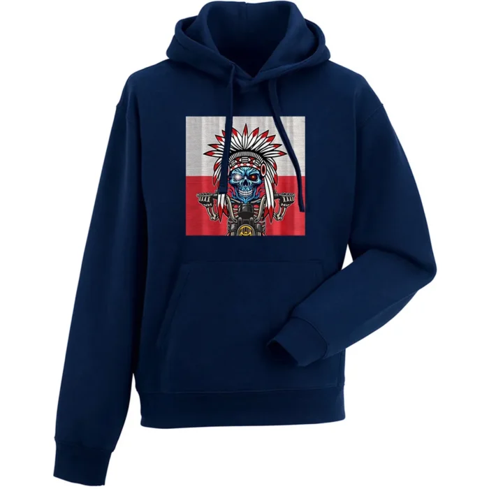 Bluza męska z kapturem z grafiką Andrzeja Warty „Polska Kontrastów” to plakatowy zderzak ognia i lodu. W centrum lodowobłękitna czaszka z błyskiem w oku, osadzona w biało-czerwonym pióropuszu — symbol przeciwnych energii i nieustępliwego charakteru. Niżej szkieletowe dłonie zaciskają się na kierownicy motocykla, a metaliczne detale nadają ilustracji drapieżny, „maszynowy” rytm. Tło w barwach flagi potęguje kontrast z chłodną twarzą, a ostry czarny kontur trzyma całość w ryzach. Gęste cieniowania i precyzyjna kreska nagradzają zbliżenie, pozostając jednocześnie czytelne z daleka. To grafika dla tych, którzy lubią mocny przekaz, symbolikę i odważne mieszanie estetyk — od miasta po koncerty.