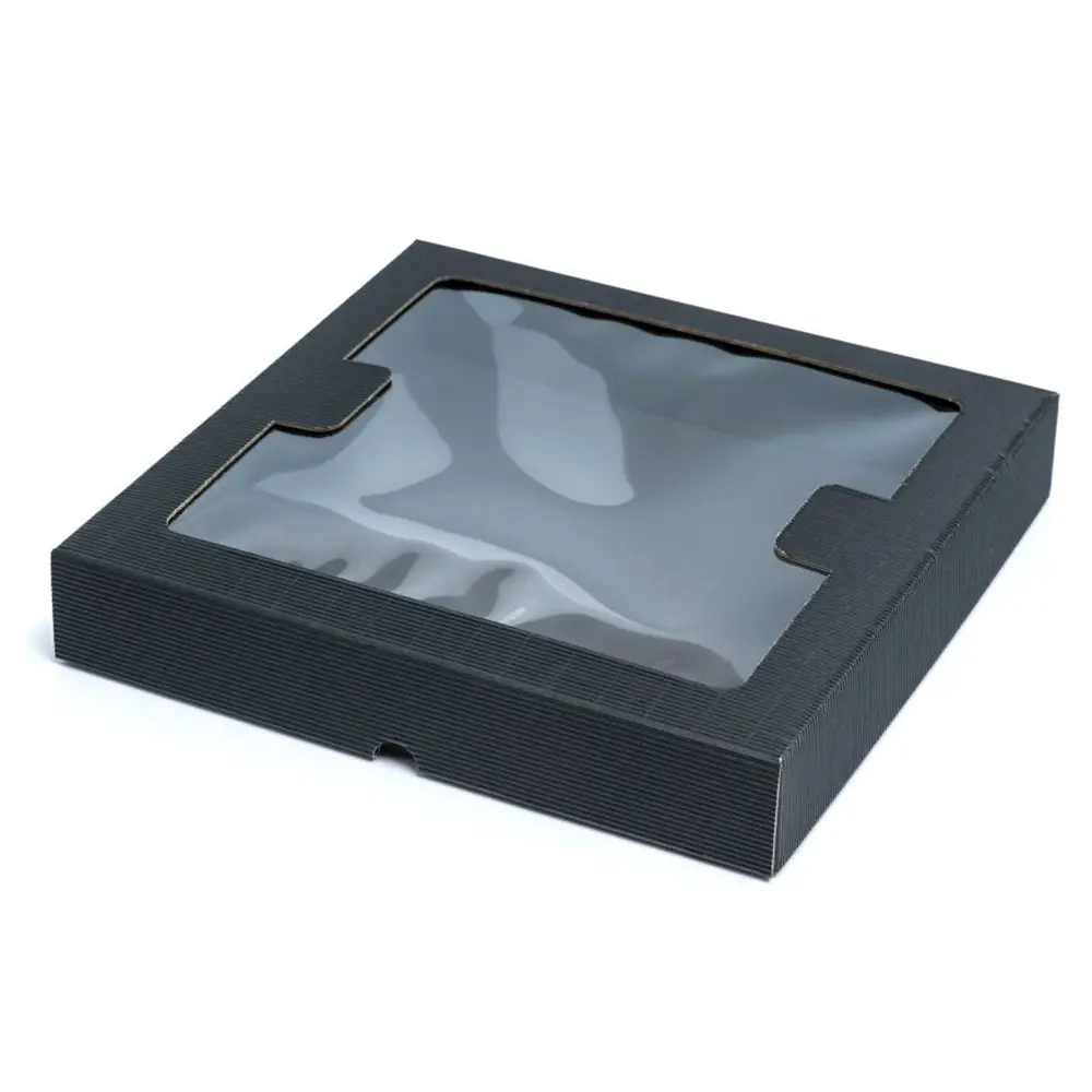 Czarne pudełko prezentowe z okienkiem. Wykonane z karbowanej tektury. Mieści do 2 koszulek (lub innych podobnych rozmiarowo produktów) albo 1 bluzę.