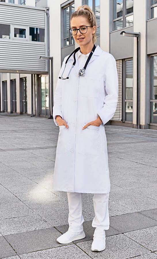 Proponowany przez nas fartuch medyczny to połączenie wygody, funkcjonalności oraz komfortu. Przeznaczony dla kobiet. W rozmiarach od XS do XXL. Szczególnie polecamy go lekarkom, studentkom kierunków medycznych oraz pokrewnych, pracownicom naukowym, laborantkom, doradczyniom zdrowotnym. Sprawdzi się doskonale w sterylnych warunkach szpitalnych i specjalistycznych laboratoriach, jak również w ogólnodostępnych przychodniach. Taki fartuch pełni ważną funkcję ochronną. To bariera przeciw zarazkom i drobnoustrojom z zewnątrz, jak również ochrona przed różnego rodzaju substancjami. Fartuch w 100% uszyty jest z tkaniny bawełnianej. Dzięki temu nie jest tak łatwopalny jak poliester (ważne przy doświadczeniach chemicznych czy fizycznych). Ma klasyczny żakietowy krój (tylko przedłużony). Jest zapinany na guziki. Z przodu na lewej piersi jest jedna duża kieszeń. Natomiast u dołu na biodrach umiejscowione są jeszcze dwie obszerne kieszenie. Można w nich trzymać niezbędne podczas pracy przedmioty. Fartuch zapewnia swobodę ruchów i jest bardzo wygodny w codziennym użytkowaniu. Materiał z którego jest uszyty w 100% składa się z oddychającej bawełny. Ma bardzo wysoką gramaturę (205 g/m2). Dzięki temu jest odporny na wielokrotne pranie, przecieranie się i bardziej chroni skórę przed różnymi czynnikami zewnętrznymi. Fartuch jest dostępny w kolorze białym.