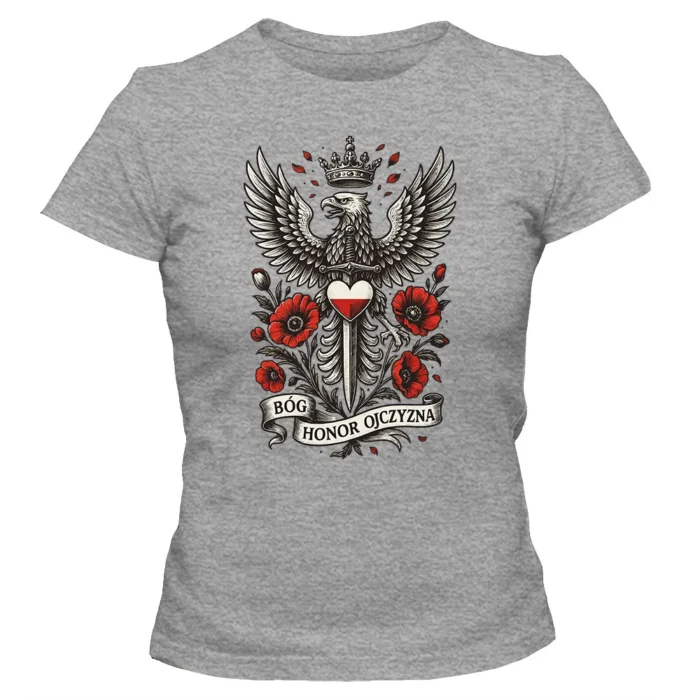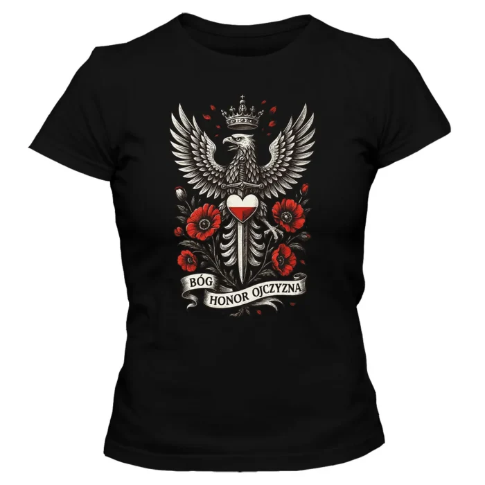 Koszulka damska „Bóg • Honor • Ojczyzna” to minimalizm z charakterem — T-shirt z autorską grafiką Barbary Holda, łączącą prostotę formy z symbolicznym przekazem. Mocny kontur liter i klarowny układ kropek tworzą nowoczesny, graficzny rytm, który wyraża dumę bez patosu. Lekko taliowany krój i okrągły dekolt ładnie układają się na sylwetce, a miękka bawełna zapewnia komfort przez cały dzień. Subtelnie wyrazisty motyw porządkuje stylizację — świetnie gra z jeansami, marynarką i prostą biżuterią, ale równie dobrze wygląda solo. To dobry wybór do pracy, na miasto i na weekend, gdy chcesz dodać klasy w uporządkowany, współczesny sposób. Lubisz spójność? Połącz T-shirt z bluzą lub torbą w tym samym motywie i stwórz mały, codzienny set.