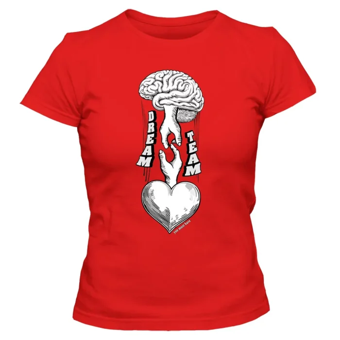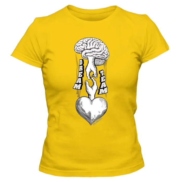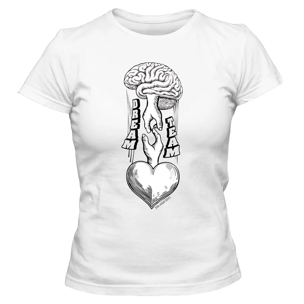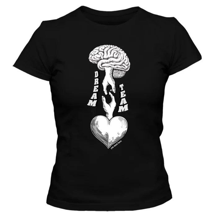Koszulka damska „Brain & Heart Dream Team” to subtelny manifest równowagi — koszulka damska z nadrukiem mózgu i serca, które grają w jednej drużynie.