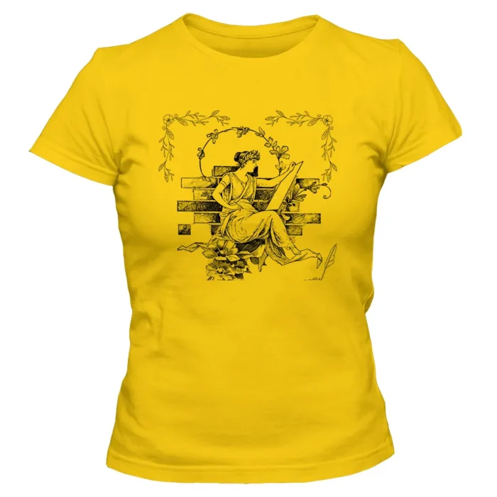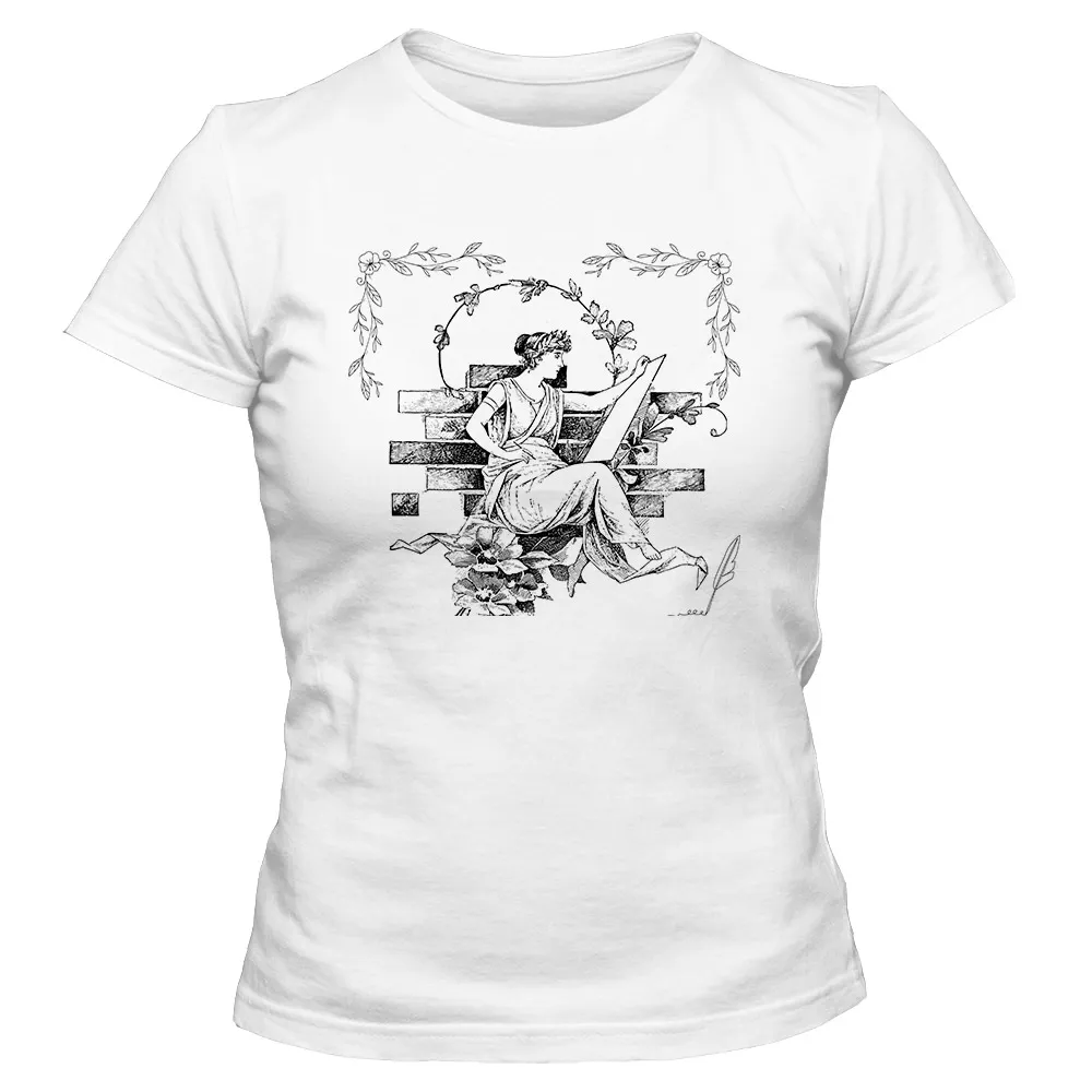 To T-shirt damski z artystyczną ilustracją „Muza” dla kobiet, które lubią mówić o sobie detalami i cenią estetykę less-is-more.