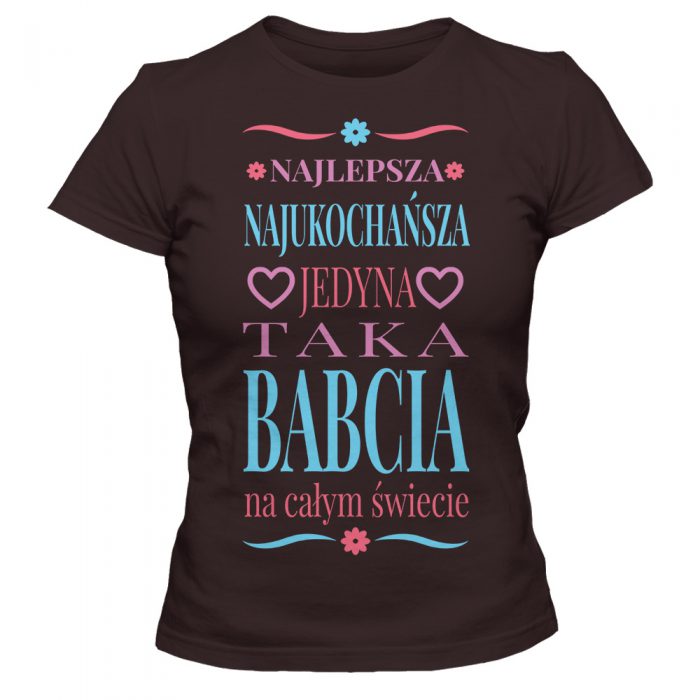 - Wyjątkowe zestawienie komplementów: Napisy „Najlepsza”, „Najukochańsza” i „Jedyna taka” to najpiękniejsza laurka, jaką babcia może dumnie nosić na co dzień.