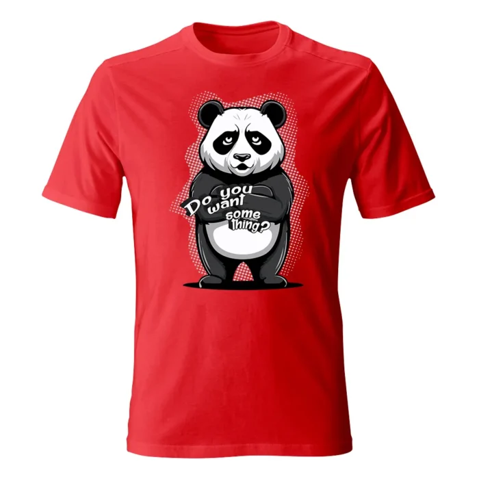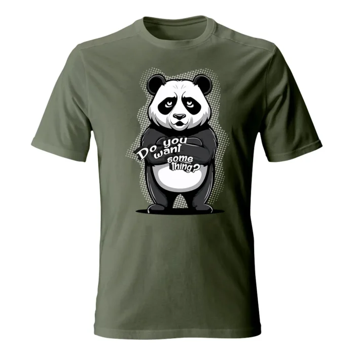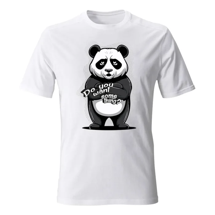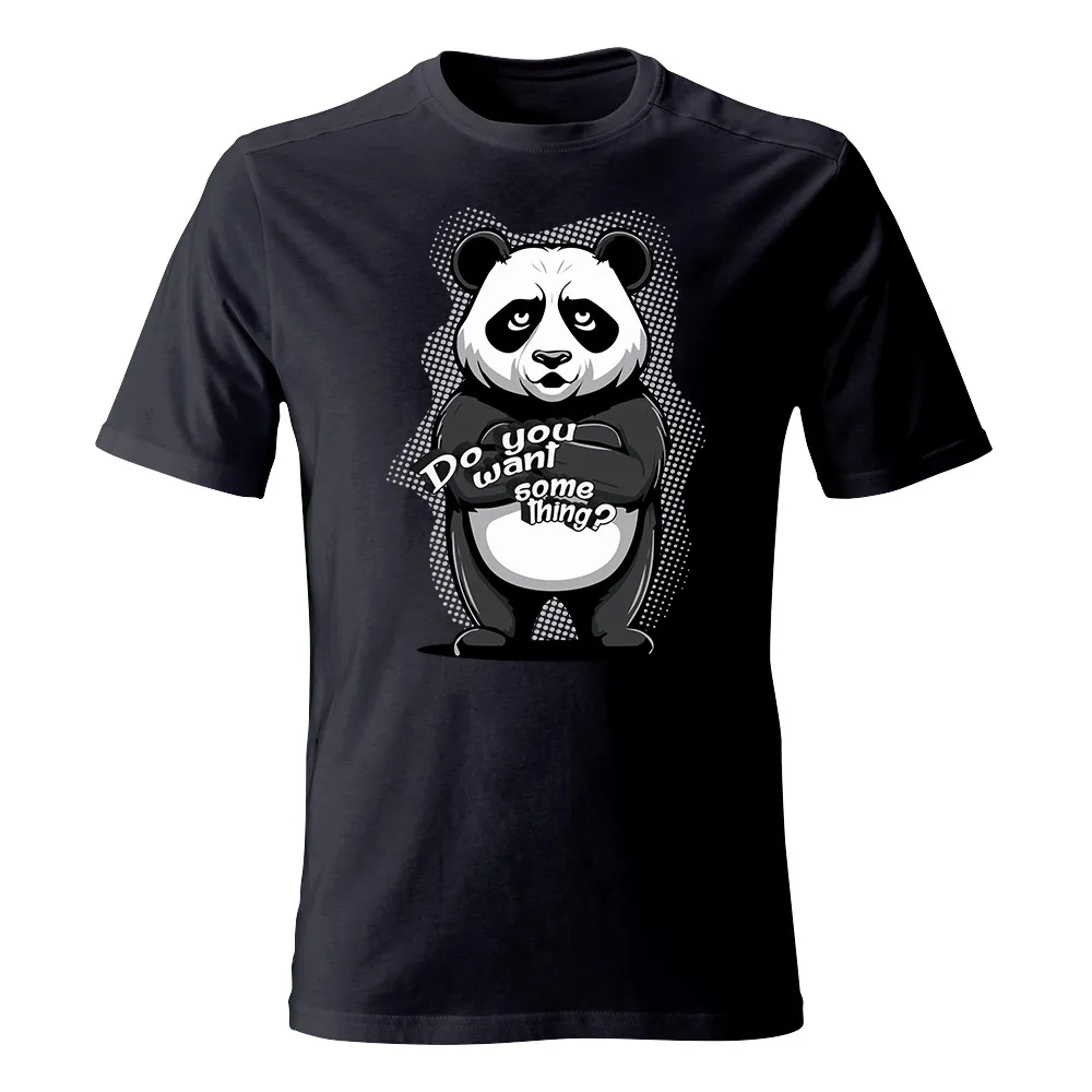 To koszulka z pandą i napisem „Do you want something?” dla fanów zwierzęcych motywów i ironicznego poczucia humoru.