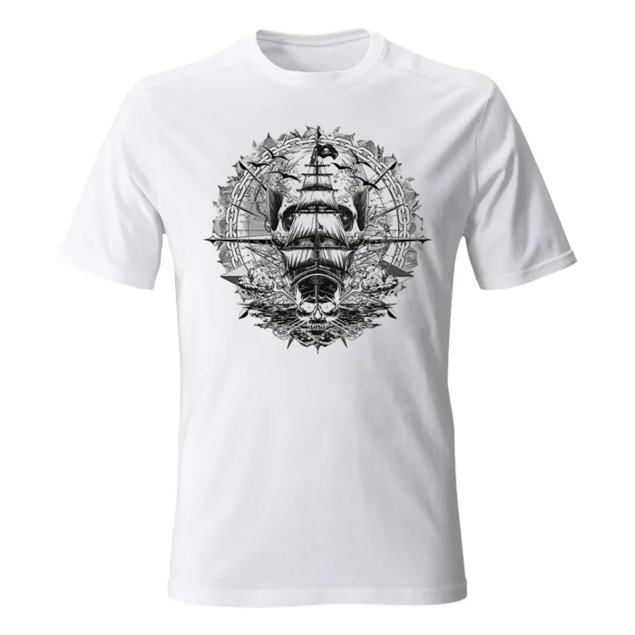 Koszulka męska z grafiką Andrzeja Warty „Piraci” to mroczna morska opowieść: w centrum żaglowiec pod czarną banderą, a niżej czaszka z piszczelami odbita w spienionej wodzie. W tle majaczy monumentalna czaszka spleciona z mapą, mewami i kłębami chmur. Okrąg z łańcucha i ostre igły kompasu spinają kompozycję, przywołując klimat polowania na skarb i nawigacji po bezkresie. Monochromatyczna, kontrastowa kreska łączy tatuażowy vibe i estetykę starej ryciny, pełnej mikrodetali do odkrywania z bliska. Idealna dla poszukiwaczy przygód, fanów marynistyki i mrocznych legend — na koncert, festiwal, nad morze albo gdy chcesz dodać stylu z nutą buntu. Ta sama grafika jest dostępna także na innych produktach. Stwórz z nich całą serię.