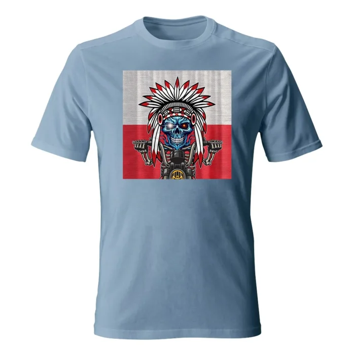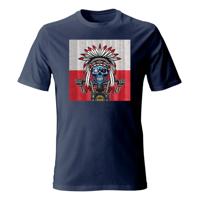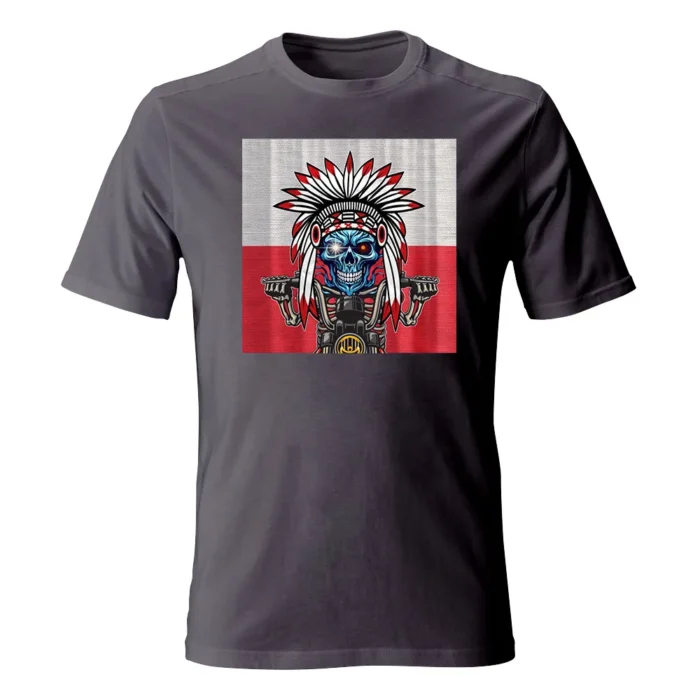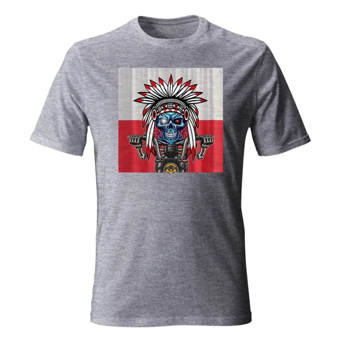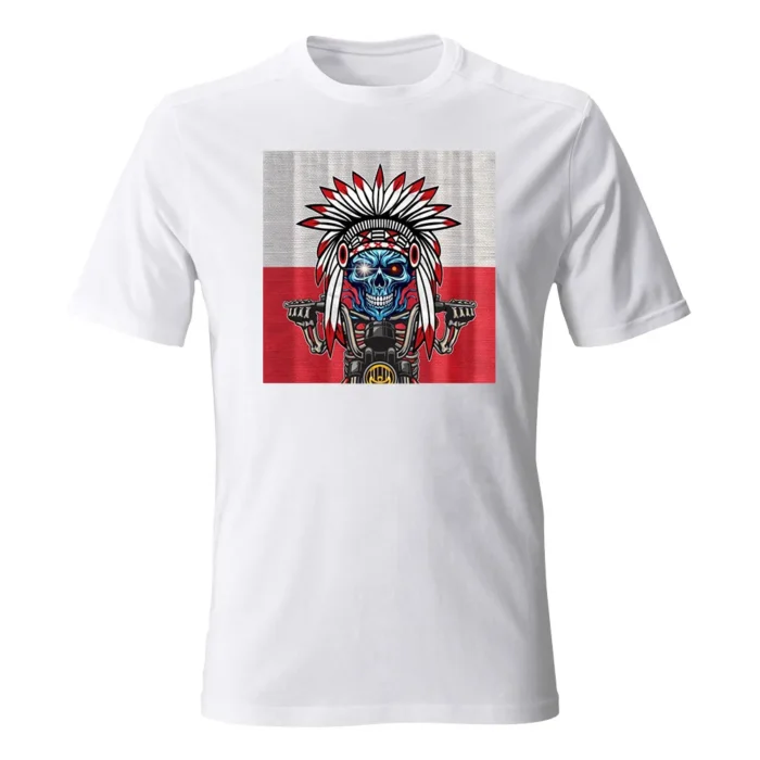 Koszulka męska z grafiką Andrzeja Warty „Polska Kontrastów” to mocny, plakatowy kadr zderzający ogień i lód. W centrum lodowobłękitna czaszka z błyskiem w oku, osadzona w biało-czerwonym pióropuszu — jak znak sprzecznych energii i charakteru. Szkieletowe dłonie chwytają kierownicę motocykla, a metaliczne detale maszynowo „dociążają” ilustrację. Tło w barwach flagi potęguje kontrast z chłodną twarzą i ostrym, czarnym konturem. Gęste cieniowania i precyzyjne linie nagradzają zbliżenie, a z daleka motyw czytelnie „łapie” wzrok. To grafika dla tych, którzy lubią symbolikę, mocny przekaz i odważne zderzenia stylów.