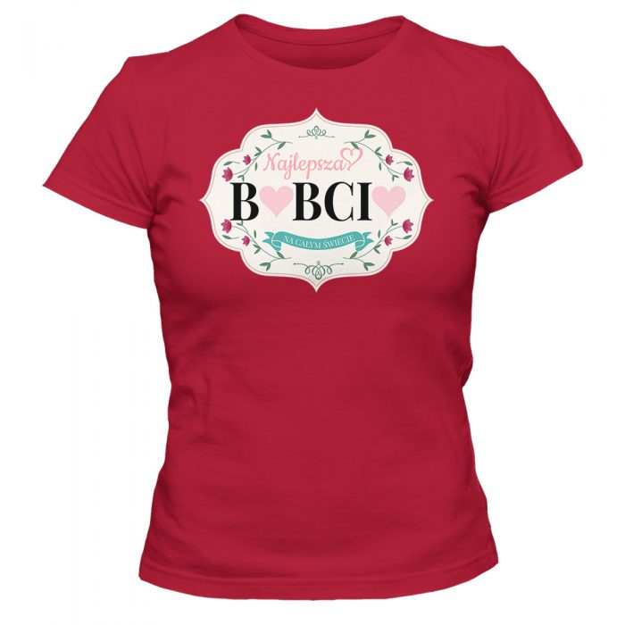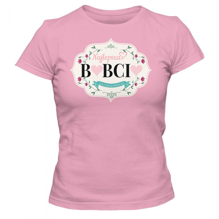 - Uroczy i pełen ciepła wzór: Napis „Najlepsza BABCIA” z różowymi serduszkami wkomponowanymi w tekst nadaje koszulce wyjątkowo rodzinnego i czułego charakteru.