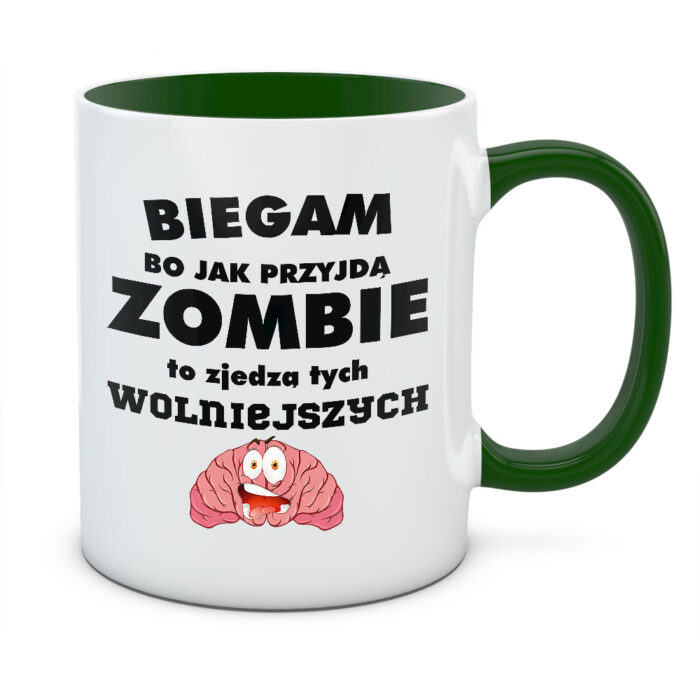 Kubek z nadrukiem Biegam, bo jak przyjdą zombie, to zjedzą tych wolniejszych to gadżet dla wszystkich, którzy kochają bieganie i się tego nie wstydzą.