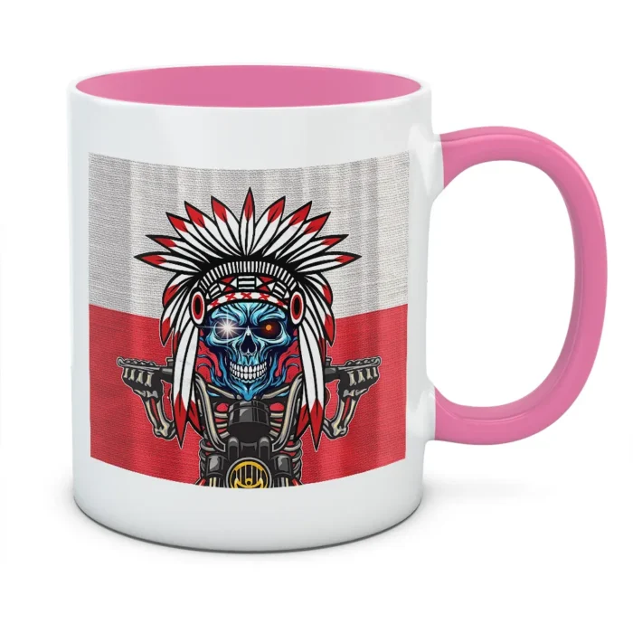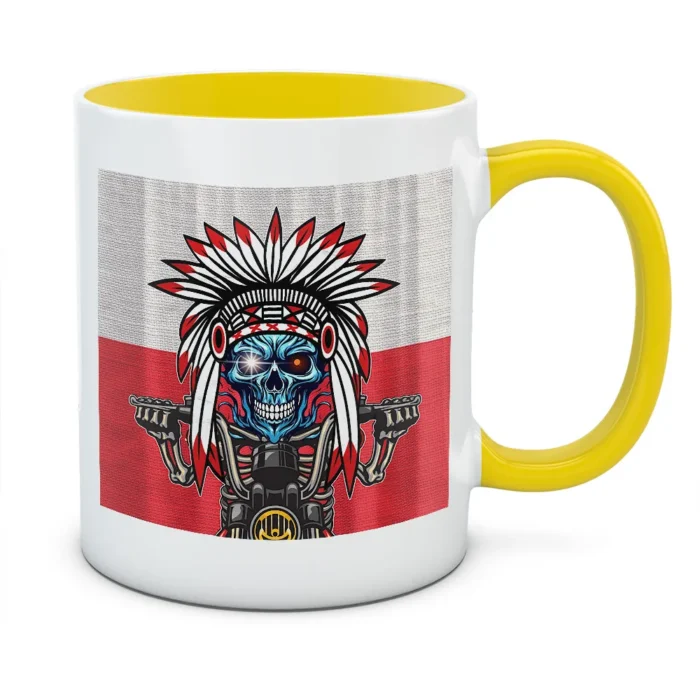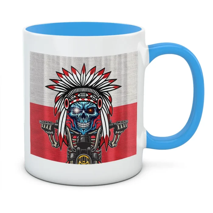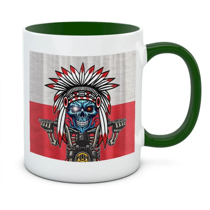 Kubek z grafiką Andrzeja Warty „Polska Kontrastów” to plakatowy zderzak ognia i lodu w formacie 360°. Na obwodzie kubka widać lodowobłękitną czaszkę z błyskiem w oku, osadzoną w biało-czerwonym pióropuszu. Poniżej szkieletowe dłonie zaciskają się na kierownicy motocykla, a metaliczne detale „dociążają” scenę. Tło w barwach flagi potęguje kontrast z chłodną twarzą, a ostry czarny kontur trzyma kompozycję w ryzach. Gęste cieniowania i precyzyjna kreska nagradzają zbliżenie — każdy obrót kubka odsłania nowe smaczki. Kubek z grafiką Andrzeja Warty „Polska Kontrastów” to wybór dla tych, którzy lubią symbolikę, mocny przekaz i odważne mieszanie estetyk — od biura po spotkania w mieście.