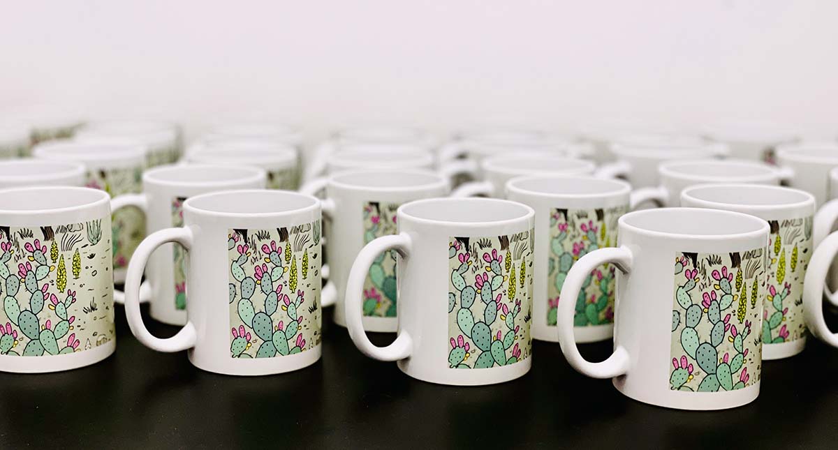 Po kubkach drukujemy metodą sublimacji czyli trwałego barwienia materiału (w tym wypadku ceramiki). Korzystamy z drukarek Epsona oraz ekologicznych farb wodnych z certyfikatem OEKO-TEX Eco Passport.
