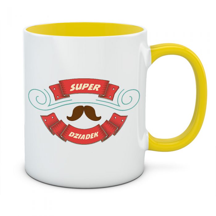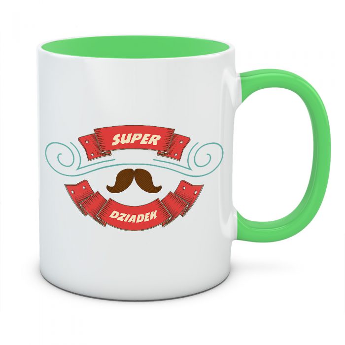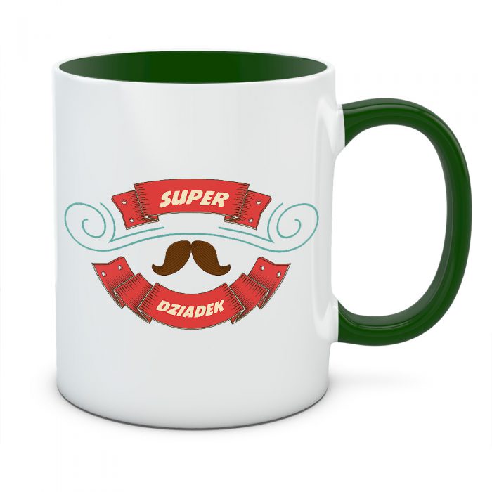 Twój dziadek to człowiek, który uważa, że klasa jest zawsze w modzie? Kubek „Super Dziadek” z grafiką stylizowaną na vintage to ukłon w stronę „starej szkoły” wychowania i stylu. Charakterystyczne czerwone wstęgi, ozdobne turkusowe zawijasy i solidny wąs tworzą kompozycję przypominającą szyldy przedwojennych mistrzów rzemiosła.