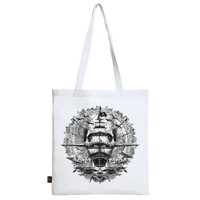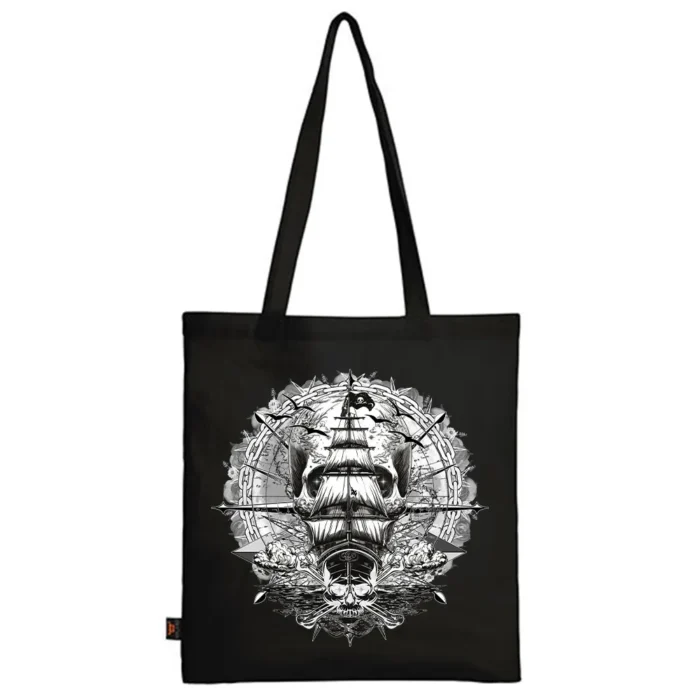 Torba bawełniana z grafiką Andrzeja Warty „Piraci” przenosi w świat morskich łowów i tajemniczych map. Centralny żaglowiec pod czarną banderą rozcina fale, a poniżej w tafli wody majaczy czaszka z piszczelami. W tle monumentalny zarys czaszki splata się z mapą, mewami i burzowymi chmurami, potęgując klimat przygody. Kompozycję spina okrąg z łańcucha oraz igły kompasu — symbole buntu, nawigacji i poszukiwania skarbów. Monochromatyczna, „tatuażowa” kreska nawiązuje do starej ryciny i kusi mnóstwem detali do oglądania z bliska. Ten motyw znajdziesz też na innych produktach.