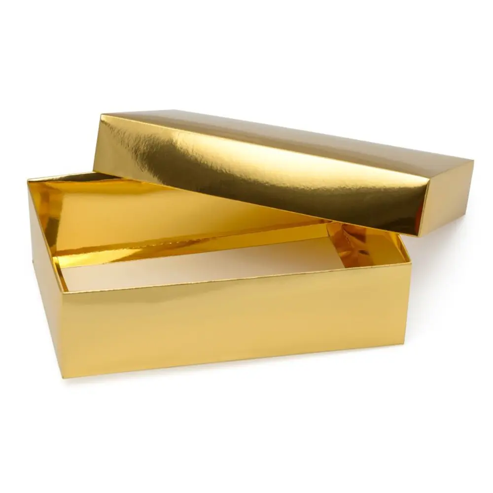 Złote, błyszczącee pudełko prezentowe. Wykonane z gładkiej, lakierowanej na wysoki połysk tektury. Mieści 2 koszulki lub inne podobne rozmiarowo produkty.